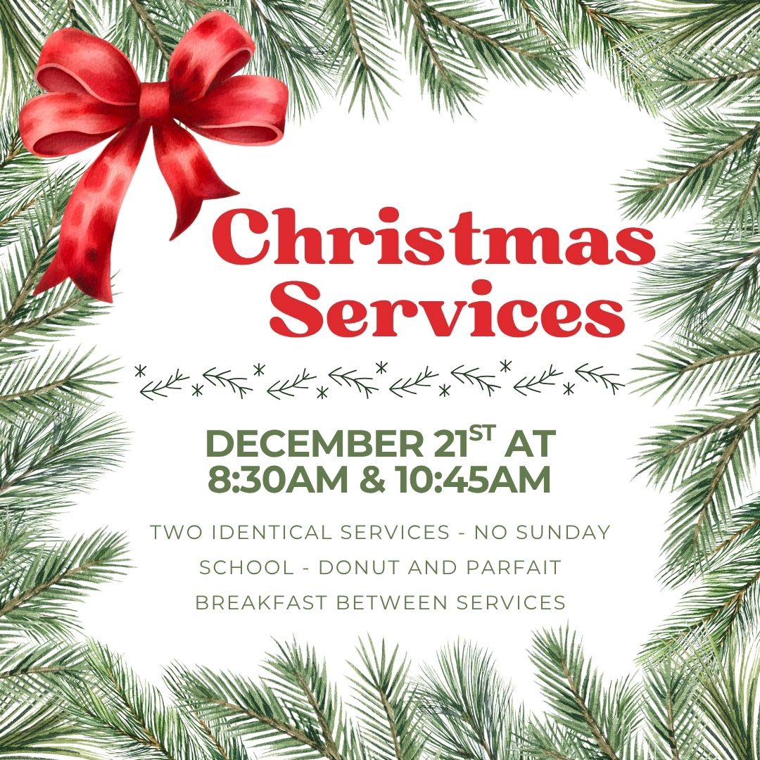 Join us on December 21st, 2025 for our Christmas services! Both services will be identical – 8:30am & 10:45am – with a donut and parfait breakfast in between the services. No Sunday School – but bring your family and friends and join us to celebrate the birth of King Jesus!