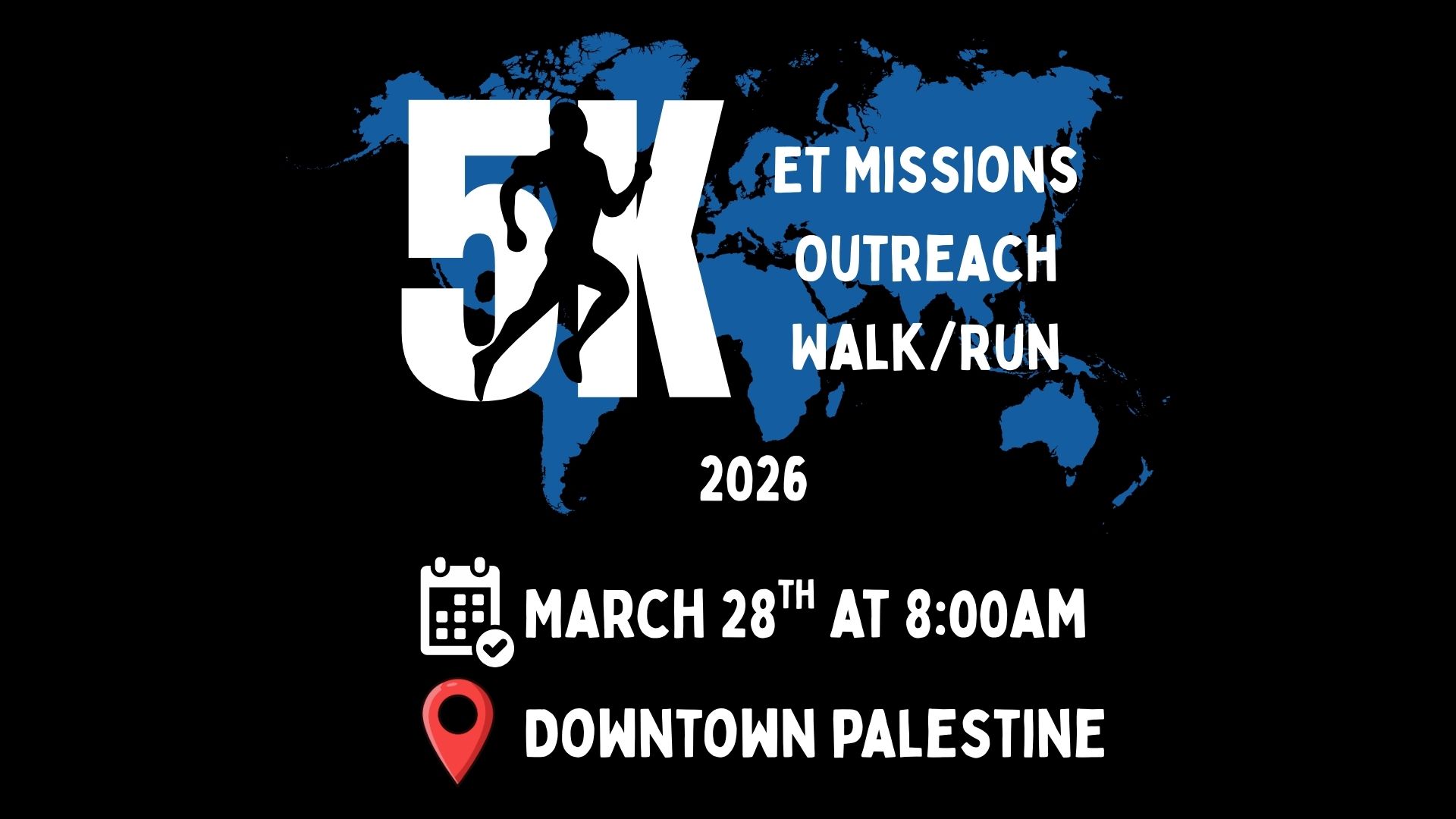 Our 5K Walk/Run is scheduled and we hope to see you there on March 28th @ 8:00 starting downtown in front of the Palestine Chamber of Commerce building! This race is to support our 2026 Mission teams going to Kenya, Guatemala, Belize!