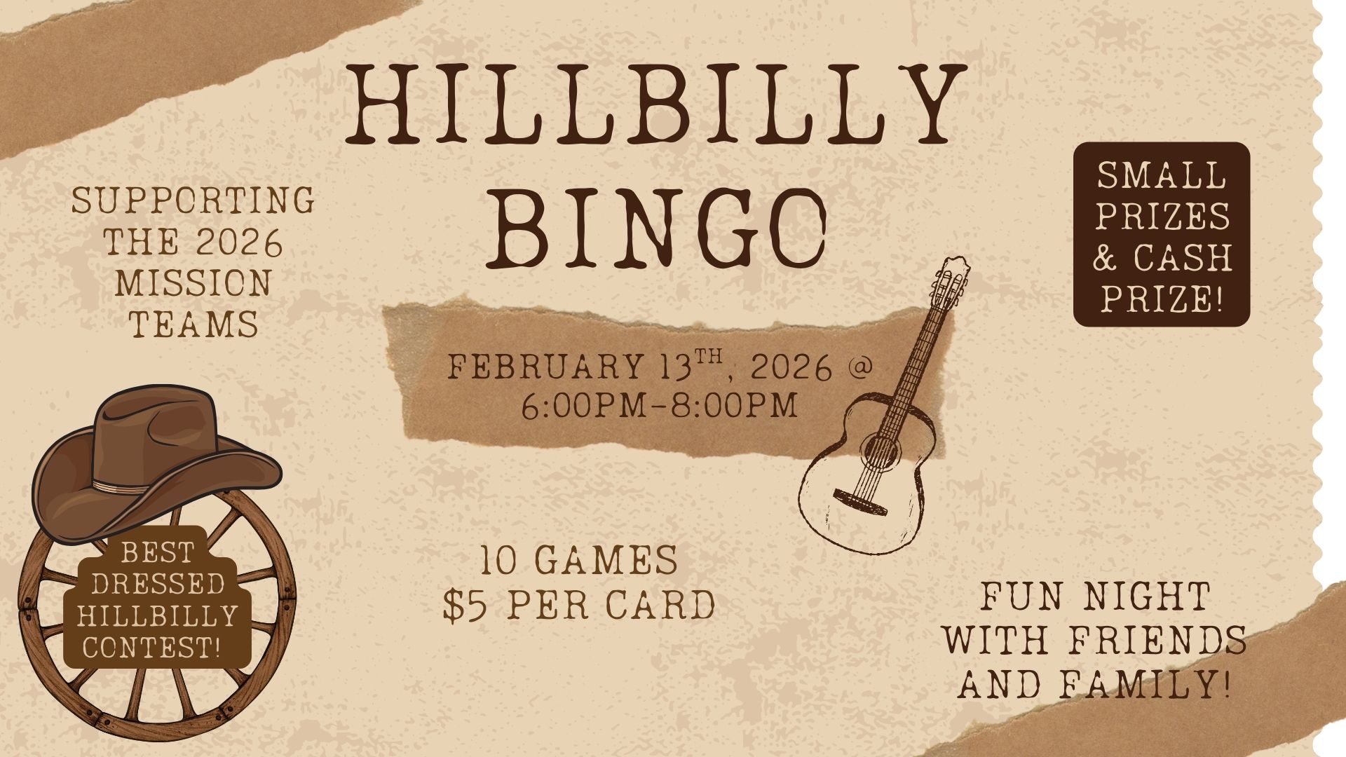 Our first big fundraiser for our 2026 Missions is HILLBILLY BINGO! On February 13th here at ET Palestine from 6:00pm-8:00pm in the Fellowship Hall. Come dressed and ready to win!
